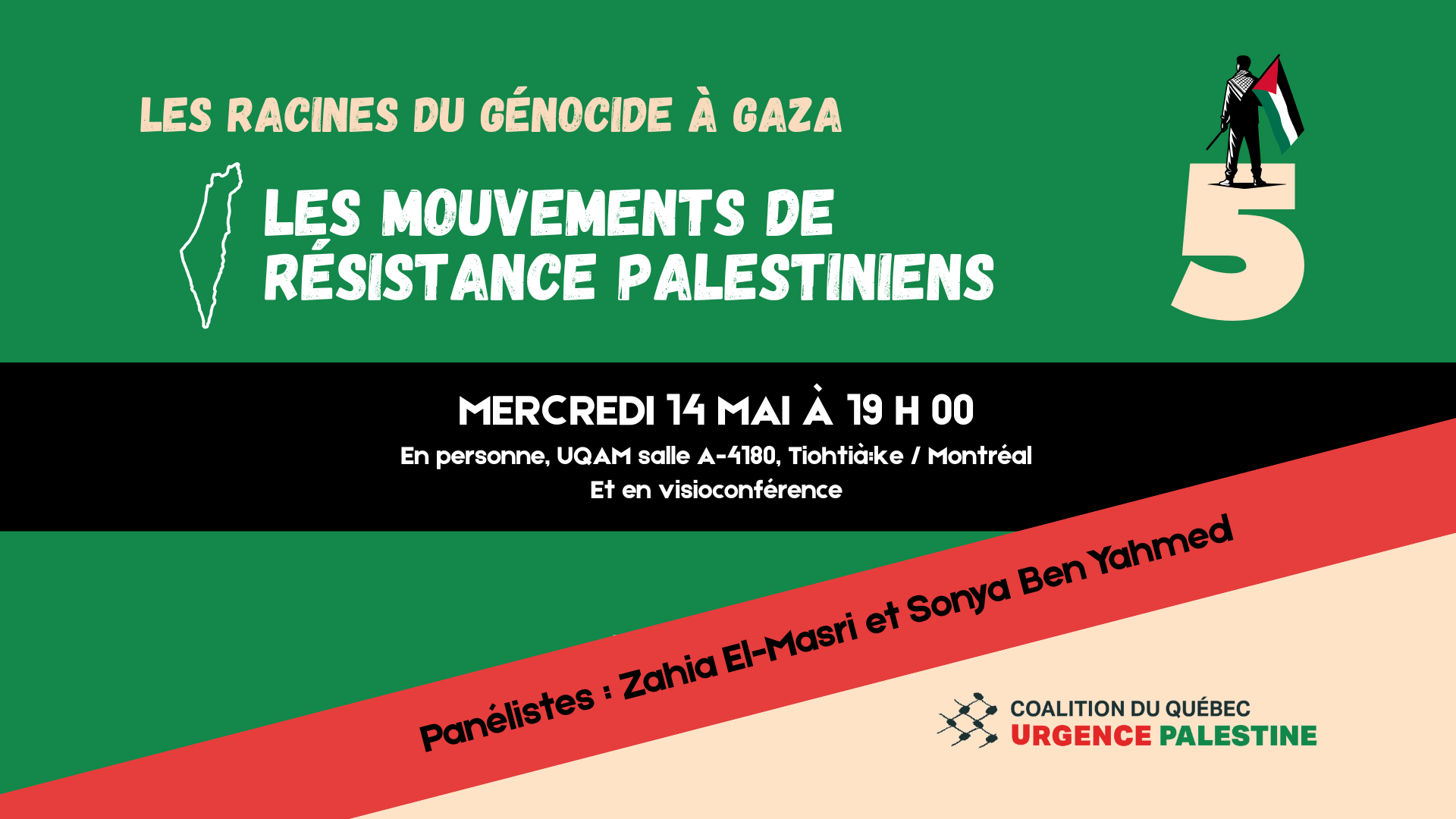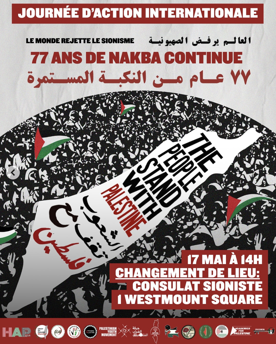 La Coalition du Québec URGENCE Palestine appelle ses membres et sympathisant.e.s à participer en grand nombre à cette manifestation pour commémorer l'expulsion par la force de 750 000 Palestinien.ne.s qui a présidé à la création de l'État d'Israël en 1948, une Catastrophe (Nakba) qui s'est prolongée depuis par la poursuite du projet sioniste de dépossession du peuple palestinien jusqu'au génocide actuel à Gaza.